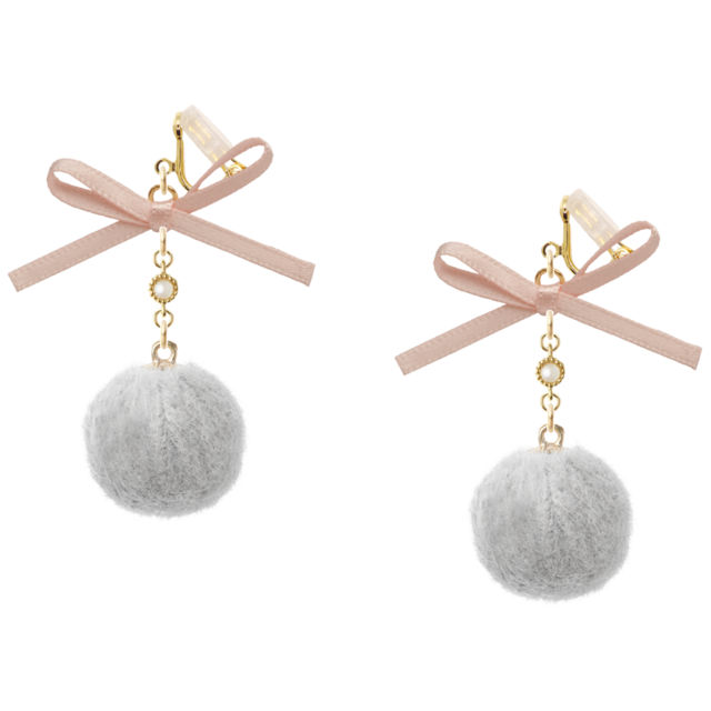 • 高品質 16K イヤリング | ベビーピンク リボン 大人可愛い グレー ファーボール パール 真珠 ギフト プレゼント monomy モノミー ✻ ゴールド 金 (No.41)