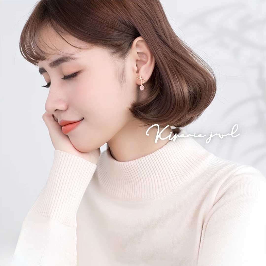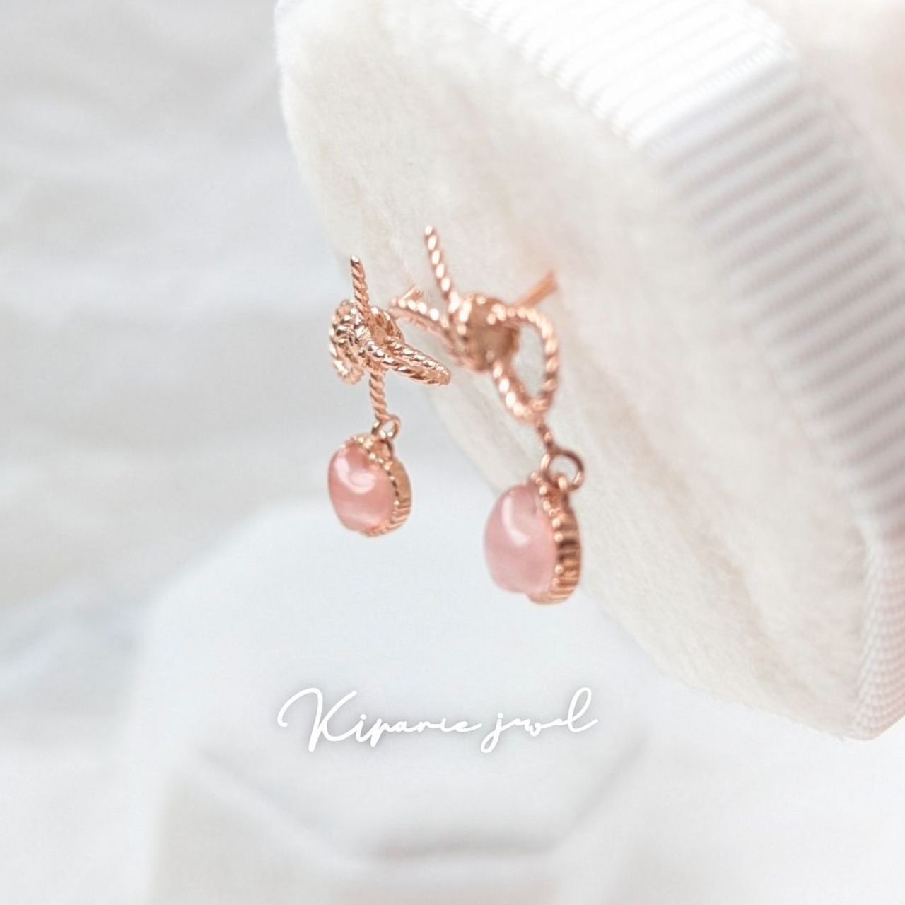 18K | 揺れる ハート の ピンク キャッツアイ & りぼん 大人可愛い スタッドピアス SV925 スターリングシルバー ✼ ローズゴールド