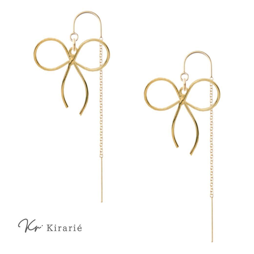 手書き風の可愛いリボンが揺れる、フックチェーンピアスです。