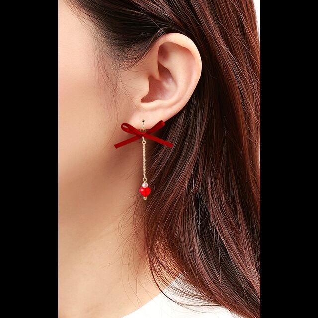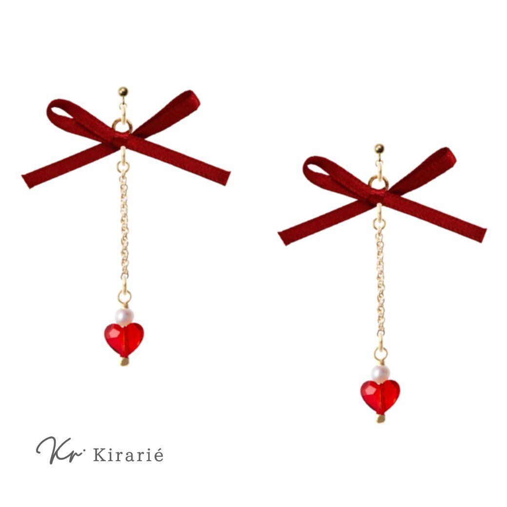 そこにレッドサテンリボンを添え、華やかさと大人の可愛らしさを表現したスタッドピアスです。肌に優しいアレルギー対応パーツでデイリーにも◎