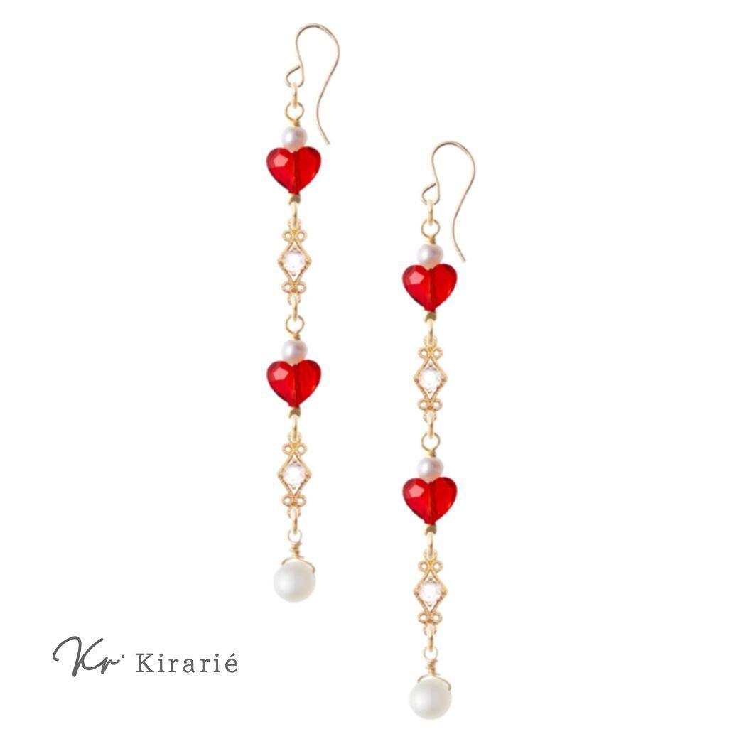 耳元で上品に揺れるCZダイヤモンドと淡水パール、そして可愛い赤色のハート型スワロフスキークリスタルの輝きが華やかにあなたを彩ります。