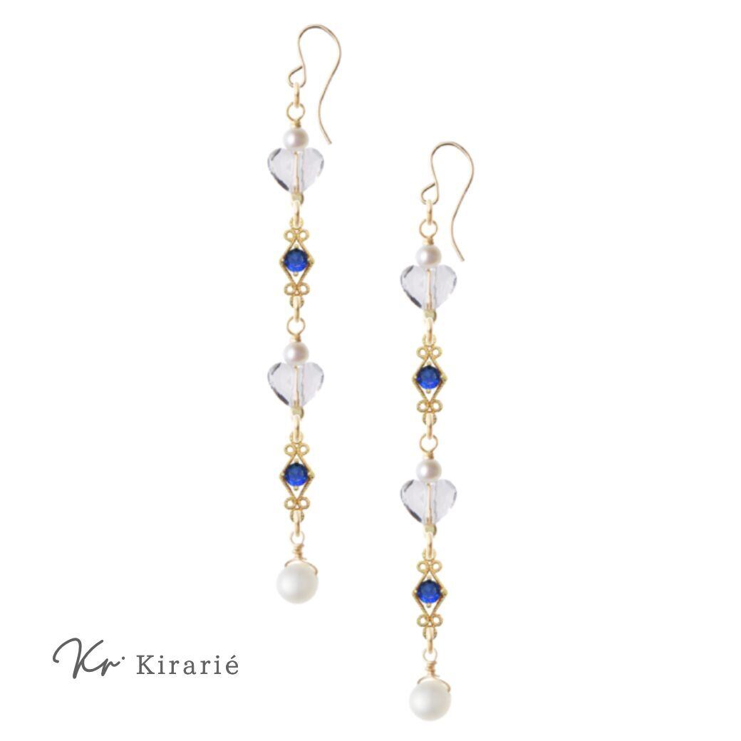 耳元で上品に揺れる透き通るブルーのCZダイヤモンドと淡水パール、そして可愛いハート型スワロフスキークリスタルの輝きが華やかにあなたを彩ります。