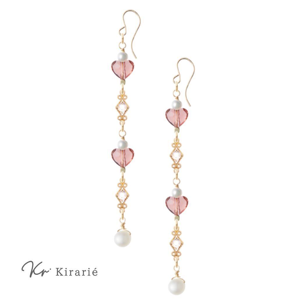 耳元で上品に揺れるCZダイヤモンドと淡水パール、そして可愛いローズ色のハート型スワロフスキークリスタルの輝きが華やかにあなたを彩ります。